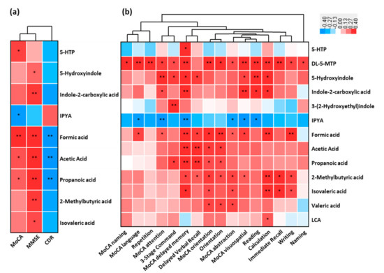 Linkage between altered metabolites of AD and cognitive impairment. Heat maps of Spearman rank correlation between the altered fecal metabolites including tryptophan metabolites, SCFAs, and bile acids, and (a) clinical parameters reflecting cognition function and disease severity, and (b) sub items in MoCA (naming, language, attention, delayed memory, orientation, abstraction and visuospatial) and MMSE sub domains (repetition, 3-stage command, delayed verbal recall, orientation, reading, calculation, immediate recall, writing and naming). Note: * p < 0.05; ** p < 0.01. Red means positive correlation and blue means negative. Abbreviations: MoCA, Montreal Cognitive Assessment; MMSE, Mini-Mental State Examination; CDR, Clinical Dementia Rating.