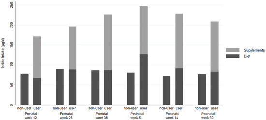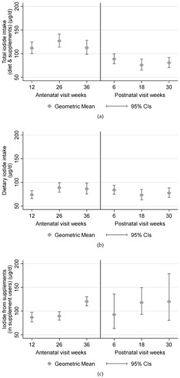 Iodide intake during pregnancy and postnatally. (a) Total intake; (b) dietary intake; (c) supplemental iodide intake amongst users of iodide supplements.