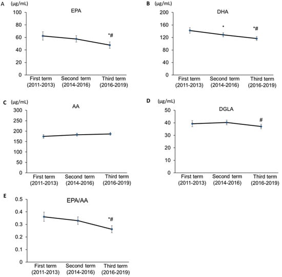 Secular trend in age- and sex- adjusted polyunsaturated fatty acids and EPA/AA. (A) EPA, (B) DHA, (C) AA, (D) DGLA, and (E) EPA/AA Data are presented as mean ± 95% confidence interval. EPA, eicosapentaenoic acid; DHA, docosahexaenoic acid; DGLA, dihomo-γ-linolenic acid; AA, arachidonic acid. * p < 0.05 versus first term and # p < 0.05 versus second term. Analysis of covariance allowed the comparison of PUFAs among groups while taking into account age and sex. For multiple comparisons, the Bonferroni post-hoc test was applied.