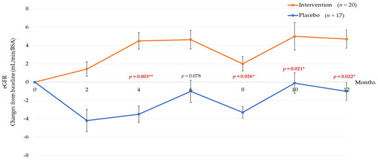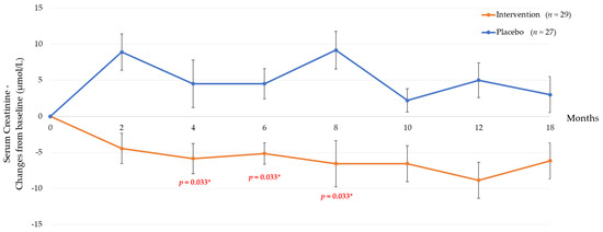 Changes in serum creatinine in intervention and placebo group throughout the study period of 18 months. Data are presented as mean ± standard deviation. * Significant at p < 0.05.