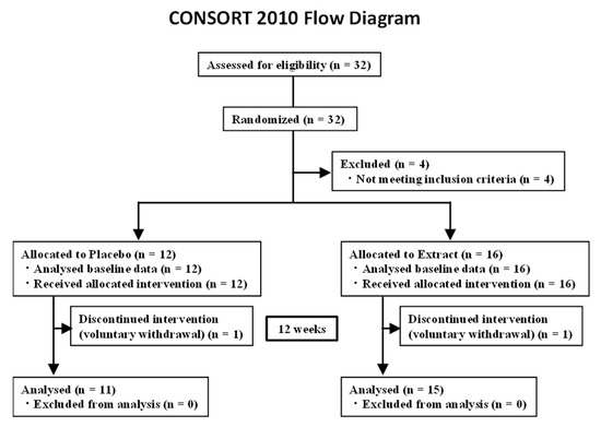 One stick contained 1800 mg of CT extract, 72 mg fine silicon dioxide, and 1782 mg dextrin. One stick, once per day, was taken with swallowing aid jelly (Ryukakusan Co., Ltd., Tokyo, Japan). Placebo powder contained 48 mg caramel coloring, 72 mg fine silicon dioxide, and 3480 mg dextrin. One stick was taken once daily with swallowing aid jelly. Mixing powders and packaging were prepared by the manufacturer (Sankyo Co., Ltd., Fuji, Japan) following Good Manufacturing Practice controls and ISO 22,000 certification. The dose of CT extract taken each day was 1800 mg.