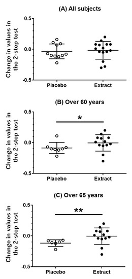 Change in values obtained in the two-step test in the placebo and CT extract groups. Change in values obtained in the two-step test pre-and post-treatment was compared. (A) All subjects (placebo; n = 11, CT extract; n = 15), (B) subjects aged > 60 years (placebo; n = 8, CT extract; n = 13), and (C) subjects aged > 65 years (placebo; n = 6, CT extract; n = 13) were analyzed. * p < 0.05, ** p < 0.01 (Mann Whitney test).