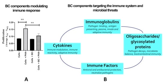 Cytokines are peptides/proteins involved in immune activation and recruitment, cellular signalling, and pathogen recognition. Cytokines are not usually involved in normal cellular homeostasis, but become relevant at times of stress, inflammation, or injury [], stimulating actions such as differentiation, chemotaxis and protein synthesis. They regulate expression of a wide range of immune responses towards pathogens, influencing which types of immune cells are recruited for both adaptive and innate immune responses. BC and milk contain many cytokines, including TNFα, granulocyte, macrophage, and GMCSF and interleukin (IL) 1β, IL-6, IL-10 []. Cytokines likely play a role in modulating immunologic development in new-born and infants, working in combination with ingested maternal immunoglobulins and the nonspecific antibacterial factors in BC (Figure 2). Importantly, cytokines are not solely involved with stimulating inflammation, with some cytokines, such as IL-8, stimulating cell migration of colonic cell lines [], and IL-10 being involved in preventing excess inflammatory response []. In support of the idea that BC dampens excess immune reactivity, a study using human colonic carcinoma cells (HT-29) showed that treatment with BC inhibited IL-1β-induced IL-8 expression, suppressed IL-1β-induced nuclear factor kappa beta (NFκβ) activation, and inhibited the degradation of inhibitor protein NFκβ [], suggesting that BC may protect against intestinal inflammation by inhibiting the NFκβ pathway. Similarly, the presence of BC markedly reduces the phytohemagglutination (PHA)-induced proliferation of human peripheral lymphocytes (Figure 2A, previously unpublished data).