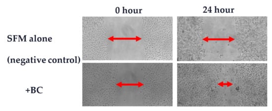 Effect of BC on cell migration. Human colonic Caco-2 cells were grown as a continuous monolayer and a standardised wound produced at time 0. The amount of closure of wound was assessed 24 h later. The presence of BC significantly increased the rate of closure compared to cells grown in serum free medium (SFM, negative control) alone.