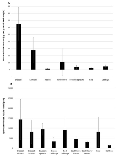 (A) Glucoraphanin content in the seeds of various Brassica vegetables. Data summarized from West et al. [88]. (B) Antioxidant ability of extracts of various Brassica vegetables, measured as quinone reductase activity induced in Hepa 1c1c7 murine hepatoma cells. Data summarized from Prochaska et al. [89].