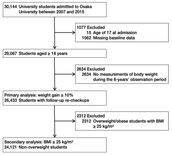 The outcome measures of the present study were weight gain ≥10% [16] in all students and overweight/obesity (BMI ≥ 25 kg/m2) [17] in students with a BMI of <25 kg/m2. Observational time was defined as the period from the health checkup at admission to (i) the incidence of each outcome or (ii) the last body weight measurement at the annual Osaka University health checkups within 6 years (=2192 days) of the baseline checkup before April 2019, whichever came first.