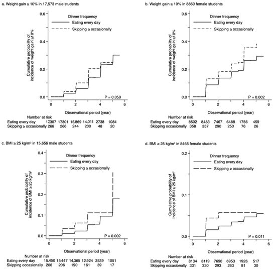 Dinner frequency and the cumulative probabilities of the incidence of ≥10% weight gain (a,b) and BMI ≥ 25 kg/m2 (c,d) in male (a,c) and female (b,d) students. BMI, body mass index.