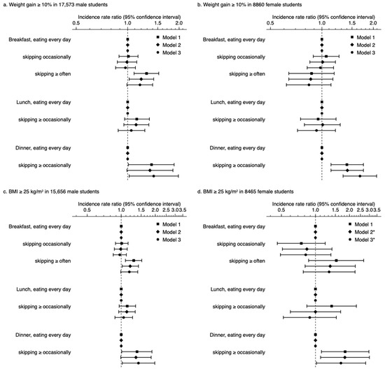 Meal frequency and incidence of ≥10%weight gain (a,b) and body mass index (BMI) ≥ 25 kg/m2 (c,d). BMI, body mass index. Model 1, unadjusted. Model 2, adjusted for admission year (2007, 2008, 2009, 2010, 2011, 2012, 2013, 2014, and 2015), age (18, 19, 20, and ≥21 years), BMI (kg/m2), smoking status (non-smokers and smokers), drinking status (non-drinkers and drinkers), dinner time (before 7 PM, 7–9 PM, 9–11 PM, and after 11 PM), and sleep duration on weekdays (<5, 5–6, 6–7, 7–8, and ≥8 h). Model 3, adjusted for covariates in model 2 and frequencies of breakfast, lunch, and dinner (e.g., breakfast frequency was adjusted for lunch and dinner frequencies). * Not adjusted for smokers because of no incidence of the outcome in smokers (n = 13).