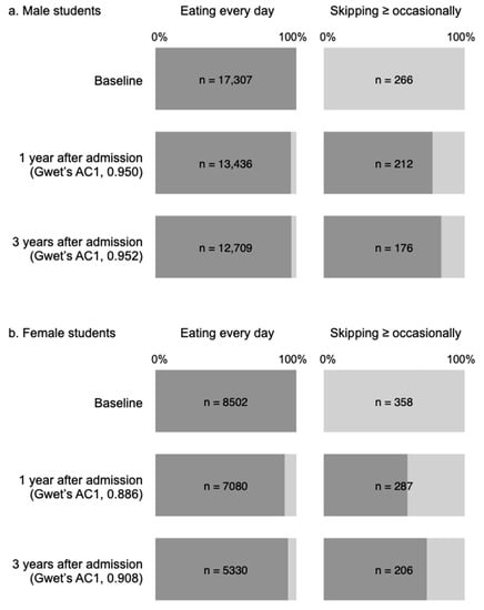 Baseline dinner frequency and dinner frequency 1 and 3 years after admission in male (a) and (b) female students. Dark and pale gray bars indicate the proportion of eating dinner every day and skipping dinner ≥ occasionally, respectively. In both male and female students, baseline dinner frequency reflected dinner frequency 1 and 3 years after admission almost perfectly (Gwet’s AC1 coefficient > 0.8).