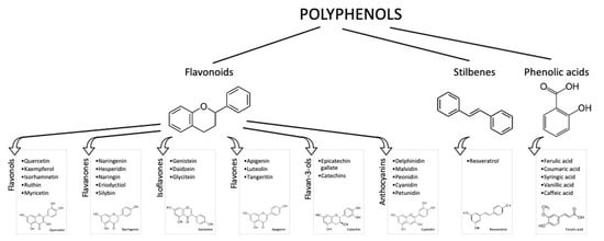 It is known that an appropriate diet and lifestyle are essential for preserving well-being and preventing illnesses. Due to their abundance in foods derived from plants (e.g., vegetables, fruits, and beverages) and their potential antioxidant activity, polyphenols have been considerably studied in the past years as adjuvants in attenuating the risk factors for disabling diseases (mainly cardiovascular disease (CVD), diabetes, cancer, and cognitive disorders) [1]. Polyphenols are phenylpropanoids synthetized by plants as secondary metabolites, in adverse situations, such as in the presence of pathogens or under adverse climatic conditions. More than 8000 phenolic molecules have been identified, which must contain at least one aromatic nucleus and one or more -OH groups [2]. Polyphenols are commonly categorized as flavonoids, characterized by a C6-C3-C6 structure, and non-flavonoids. Flavonoids generally present in foods are anthocyanins, flavonols, flavan-3-ols, flavones, isoflavones, flavanones, and stilbenes (Figure 1).