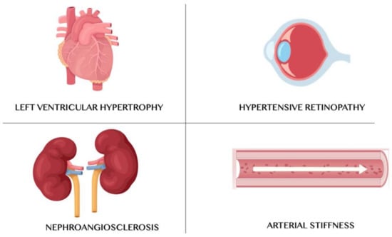 The damage caused by AH is directed to important target organs and develops essentially as a direct and/or indirect consequence of vascular pathology (Figure 3) [88]. In the majority of patients with high BP, the increased values may not be too severe, and the direct damage may develop after years of the AH onset. As previously mentioned, the organs most affected by AH are the heart, kidneys, eye retina, vessels and brain. The pathogenesis of organ damages is complex and varied [89].