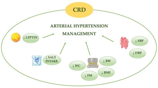 Beneficial effects of caloric restriction diet (CRD) on arterial hypertension. BMI, body mass index; BW, body weight; DBP, diastolic blood pressure; FM, fat mass; SBP, systolic blood pressure; WC, waist circumference, ↓ decrease.