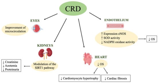 The role of CRD on the eye has been extensively investigated, especially with regard to age-related eye diseases [122], but no studies have been conducted to investigate the in vivo effect of CRD on hypertensive retinopathy. However, as reported above, it is well known that the control of BP within the normal range, also through CRD, exerts a preventive role against the onset of eye microvascular abnormalities leading to hypertensive retinopathy [123].