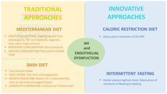 The suspicion of a AH secondary form should raise if (i) AH is resistant to a triple drug therapy that includes a diuretic drug, (ii) AH, characterized by particularly high BP values, diagnosed in young people (about 30 years of age), especially in women, (iii) in case of accelerated or malignant hypertension (renovascular hypertension), (iv) AH becomes suddenly uncontrollable with poly-pharmacological therapy or (v) there is an excessive BP values reduction after administration of RAAS blocking drugs [128]. For the prevention and treatment of secondary AH, as well as for the primary, is used a dietary model similar to the Mediterranean diet called DASH diet is used, which stands for “Dietary approaches to Stop Hypertension”. The DASH diet was developed by studies supported by the U.S National Institute of Health (NIH), as a nutritional approach for the treatment of AH that could be of valuable assistance in terms of reaching optimal BP values, with minimal use of antihypertensive drugs (Figure 4) [129]. The purpose of the DASH diet is to restore homeostasis in all AH patients with an incorrect and unhealthy lifestyle. The DASH diet is considered to be the dietary “gold standard” approach by the American Society of Hypertension in reducing multiple CV risk factors, related to primary and secondary AH [130]. The DASH diet is characterized by a high intake of fish, fruit, and vegetables; a drastic reduction of the consumption of foods rich in saturated fats, such as red meat and aged cheeses; and a complete elimination of alcohol and “kitchen salt” assumption. While CRD, previously discussed, focuses on the number of calories consumed, reducing them by 25–30%, the DASH diet mainly focuses on the quality of micro- and macro-nutrients assumed. Numerous studies have shown that the DASH diet induces a greater reduction in BP values than other dietary interventions or physical exercise programs [131].