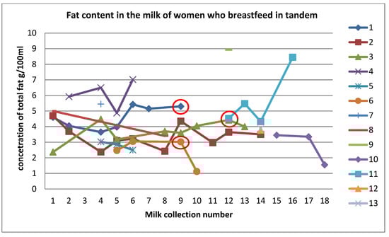 Individual changes in total fat content. The weaning time is indicated by red circle, 1–10 monthly milk collection.