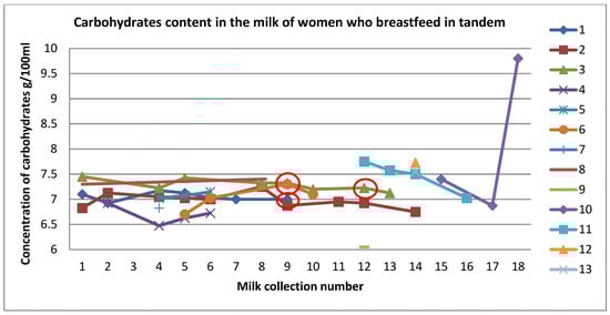Individual changes in total carbohydrate content. The weaning time is indicated by the red circle, 1–10 monthly milk collection.