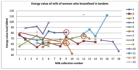 Individual changes in energy value. The weaning time is indicated by the red circle, 1–10 monthly milk collection.