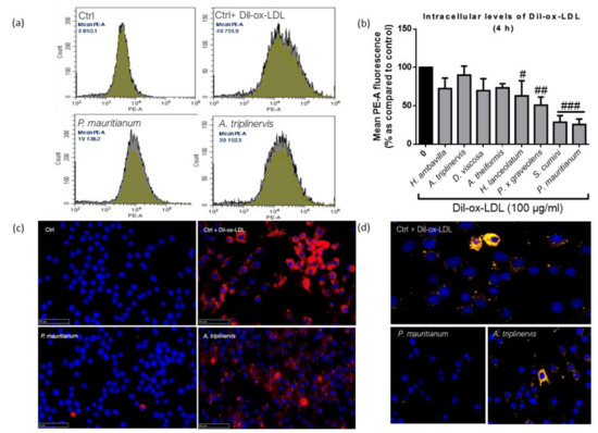As presented in Figure 3, quantitative analysis by flow cytometry (Figure 3a,b) showed that H. lanceolatum, P. x graveolens, S. cumini and P. mauritianum significantly decreased the Dil-ox-LDL uptake. Interestingly, S. cumini and P. mauritianum respectively inhibited Dil-ox-LDL uptake by 71.4 ± 8.67% and 74.3 ± 7.01%. Cells incubated with A. triplinervis showed similar profiles to that of control cells + Dil-ox-LDL, whereas P. mauritianum decoction, traditionally described for cholesterol lowering properties [26], was associated with a decreased abundance of intracellular Dil-ox-LDL (Figure 3c,d show immunocytofluorescence analyses of RAW 264.7 macrophages incubated with fluorescent Dil-ox-LDL with A. triplinervis, P. mauritianum decoctions or PBS). This property could support the traditionally described beneficial effect of P. mauritianum in cardiovascular diseases. However, this should be tested in vivo in order to assess its capacity to lower cholesterol levels (as suggested by ethnopharmacological data) and potentially to prevent foam cell formation. Our results suggest that medicinal plant decoctions could constitute a therapeutic option to prevent or reduce atherosclerosis progression, that would deserve in vivo experiments in pre-clinical models.