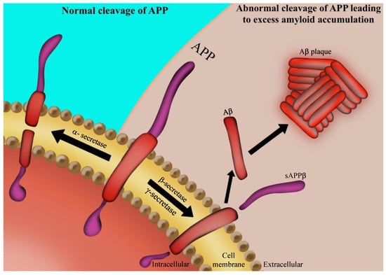 Aβ formation: the amyloid precursor protein (APP) is a transmembrane protein of the neuronal cell. In the case when it is cleaved by α-secretase, the formed soluble aggregates can be digested by microglial cells. When APP is cleaved by β-secretase and γ-secretase, it leads to formation of Aβ insoluble aggregates. Such protein aggregation results in amyloid plaques, one of the hallmarks of AD.
