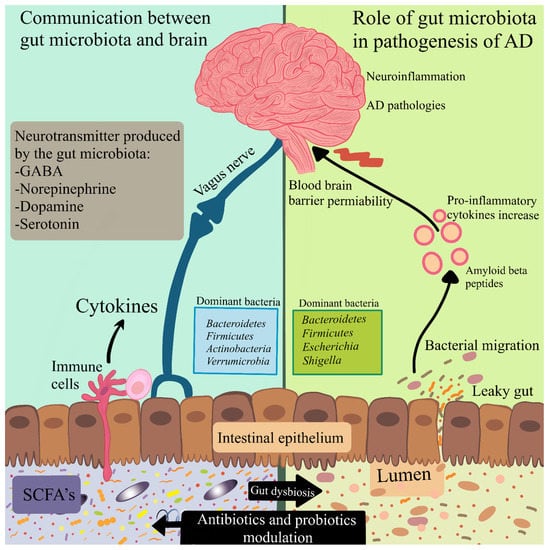 Accumulating all information from the human as well as animal studies, it can be suggested that GIT microbiota has an important role in the bidirectional communication between the brain and the gut. There is increasing evidence stating that the gut microbiota has a contribution to the pathogenesis of AD. As the gut microbiota is known as the source of a large number of amyloid, LPS, and other toxins, it can contribute to systemic inflammation and disruption of physiological barriers. The products formed by bacteria can move from the GIT to the CNS, especially in aging. Bacterial amyloid can trigger misfolding and can enhance native amyloid aggregation. The gut microbiota products can activate microglia, augmenting inflammatory response in the CNS, which in turn results in microglial function. Triggered microglia start neuroinflammation in the brain, causing loss of neurons, a major factor in AD. Modulation of the gut microbiota composition can be used as a therapeutic target in AD. Some antibiotics as well as probiotics can be implemented as a preventive measure that successfully targets ongoing inflammation. The role of antibiotics and probiotics in modulating the microbiota is under intense debate. The certain microbiota profile also strongly depends on the host’s genetics and diet. This only confirms that research on MGB involvement in AD is crucial for new treatment targets and therapies for AD.