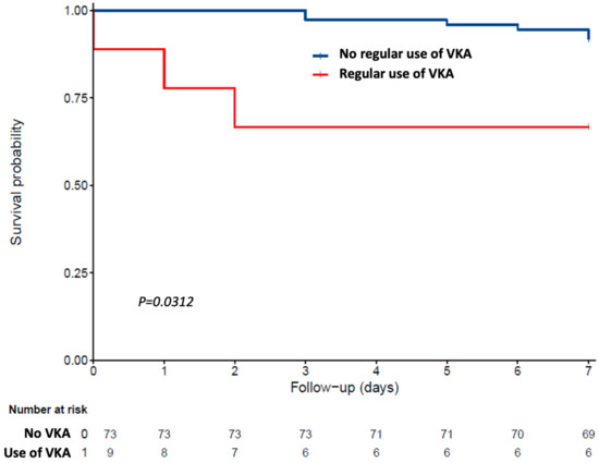 Kaplan–Meier estimates of the cumulative probability of COVID-19 participants’ survival according to the regular use of vitamin K antagonist (VKA) prior to COVID-19 (n = 82).
