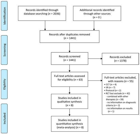 The searches identified 2036 potentially relevant studies, of which eight [20,21,22,23,24,25,26,27] studies met our inclusion criteria (Figure 1). The key data from all included RCTs are summarized in Table 1. The RCTs published in Chinese included three master theses. The sample size ranged from 30 to 180. The duration of treatment ranged from three weeks to three months. The included studies used different disease criteria. Five RCTs [21,22,24,26,27] diagnosed BD according to the 1989 ISG criteria, two RCTs [20,23] used the 1989 ISG criteria plus the Standard for Disease in Traditional Chinese Medicine diagnostic criteria, and one RCT [25] used the 2005 ICBD criteria plus the Standard for Disease in Traditional Chinese Medicine diagnostic criteria.