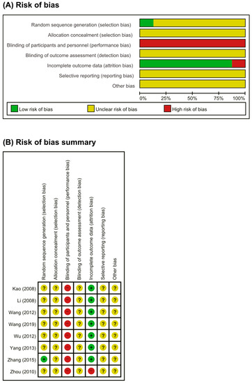 The risk of bias is presented in Figure 2. The risk of bias was assessed using the Cochrane risk of bias tool. Only one RCT [25] used the random number method for random sequence generation. Seven RCTs [20,21,22,23,24,26,27] did not report the random sequence generation method. Among the eight included RCTs [20,21,22,23,24,25,26,27], herbal medicine decoctions, and drug therapy were compared; thus, blinding could not be applied to participants and personnel. None of the RCTs described the method of allocation concealment or blinding of outcome measurement. One RCT [22] did not provide the reasons for patient drop-out and withdrawal. None of the RCTs published or registered their protocol, and they all had an unclear risk of bias with regard to selective outcome reporting.