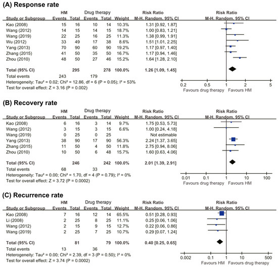 Forest plots of (A) total response rate, (B) recovery rate, and (C) recurrence rate. HM: herbal medicine.