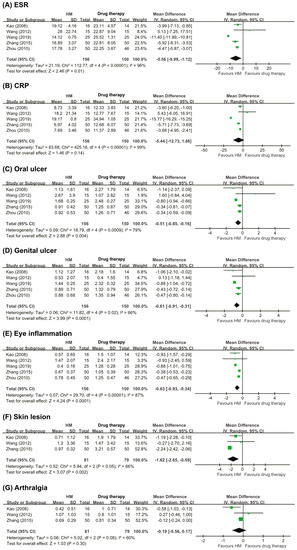Forest plots of symptoms score (A) ESR, (B) CRP, (C) oral ulcer, (D) genital ulcer, (E) Eye inflammation, (F) skin lesions, and (G) arthralgia. CRP: C-reactive protein; ESR: erythrocyte sedimentation rate; HM: herbal medicine.
