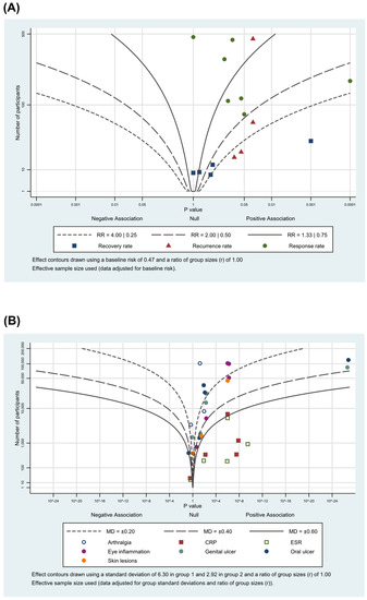 The albatross plots for the included studies are shown in Figure 5. Albatross plots were performed by illustrating contours that showed the effect direction and effect sizes range using p-values and given sample sizes. Different plotting colors correspond to the outcome subgroups. Looking at the albatross plot for dichotomous data (Figure 5A), the points scattered across different contour lines. However, most of the points clustered to the right side of the plot, showing that herbal medicine was more favorable for the treatment of BD. For the albatross plot of continuous data (Figure 5B), the points were less scattered. Although the points were clustered to the right, many points were positioned around the null line, implicating non-significant effects. Both albatross plots had points that were completely isolated, reflecting the possibility of sampling error.