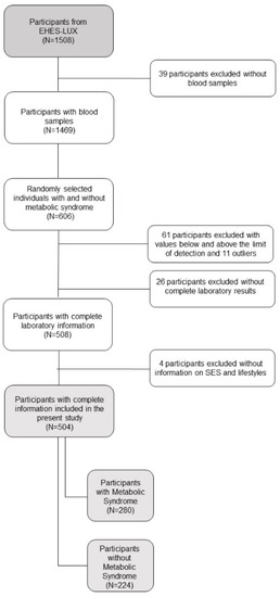 We analyzed data from 606 randomly selected individuals (315 with MetS, 291 without MetS) from the 1529 participants of the European Health Examination Survey (EHES-LUX) [26]. We selected the random sample stratified by MetS with the aim to produce a sample in which exposure varies. EHES-LUX is a cross-sectional population-based survey, representative of the general population, conducted between February 2013 and January 2015 in Luxembourg. The target sample of EHES-LUX was residents (excluding those who were living in institutions) of the Grand Duchy of Luxembourg, aged 25 to 64 years, who agreed to participate [26]. For each participant, trained nurses performed a medical examination and collected health questionnaires and biological samples (hair, blood, and urine). Examinations included blood pressure and anthropometric measurements (height, weight, waist circumference (WC), hip circumference, and thigh size), an electrocardiogram, visual acuity examination, and a spirometry. Blood samples were collected to analyze fasting blood glucose, plasma-triglycerides, plasma-cholesterol (total cholesterol, high-density lipoprotein cholesterol (HDL-C), low-density lipoprotein cholesterol (LDL-C)), and thyroid hormones. Moreover, we analyzed concentrations of selected micronutrients, markers of oxidative stress, and inflammation in the 606 selected individuals. Of these, we excluded 55 individuals with values below the limit of detection for any of the outcome measures above. We also excluded from the present analysis 16 outliers (one value of CRP > 90000 mg/mL, nine values of insulin > 2000 pmol/L, four values of F2-isoprostanes > 100.000 ng/mL, two values of folic acid > 90.8 nmol/L). Thus, 508 individuals had complete biological information. From those, 504 had complete information on socioeconomic and lifestyle characteristics (280 with MetS, i.e., cases, and 224 without MetS, i.e., controls) (Figure 1). EHES-LUX was approved by the National Ethics Committee of Luxembourg (CNER, N° 201205/07) and notified to the Commission Nationale pour la Protection des Données (CNPD). All individuals approved their participation by written informed consent.