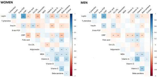 In both men and women, we observed a positive correlation between CRP and leptin and insulin and vitamin E, and a negative correlation between CRP and adiponectin and vitamin D and beta-carotene (Figure 3). Leptin was positively correlated with insulin, CRP, and vitamin E, and negatively correlated with adiponectin and beta-carotene. We also observed a positive correlation between adiponectin and vitamin D and beta-carotene and cortisol, and a negative correlation between adiponectin and leptin and insulin and CRP in women.