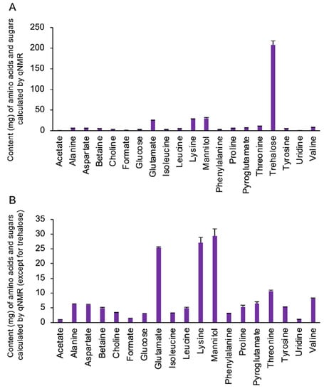 Summary of the identified components of the extract from Cordyceps militaris fruit bodies (CM). (A) The content of major components, derived by means of targeted profiling, is shown as the average content (mg) per gram (n = 4). (B) The average content of the components excluding the major component trehalose was shown.