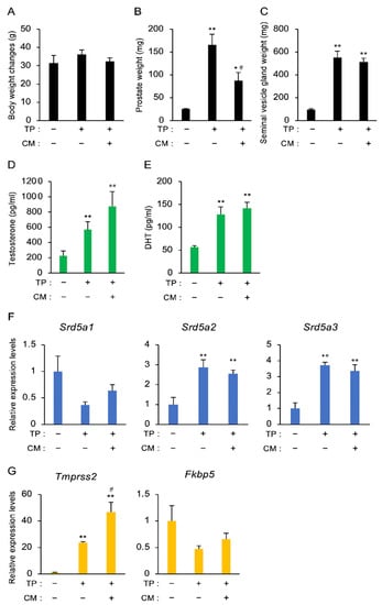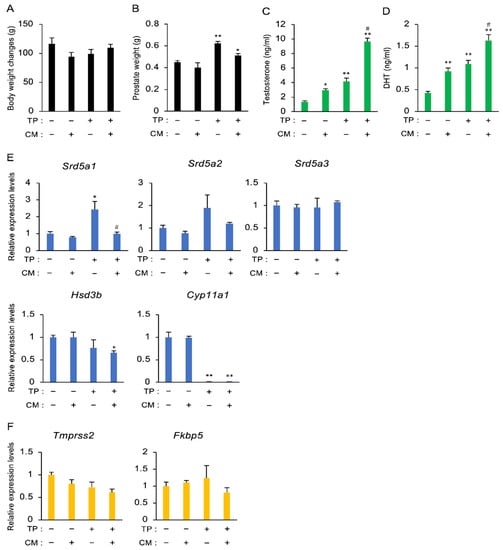 The effect of CM on BPH in rats. (A,B) Body and prostate weights on Day 30 after administration of TP (3 mg/kg, s.c.) and/or CM (20 mg/rat, p.o.). Data are presented as the mean ± SEM of five rats. (C,D) Changes in the serum levels of testosterone and DHT. Both steroids were measured by ELISA. (E) RNA isolated from the testis was subjected to qPCR analyses to evaluate the expression of Srd5a1, Srd5a2, Srd5a3, Hsd3b, and Cyp11a1. Actb and Gapdh were used as internal controls for RNA integrity. (F) Changes in Tmprss2 and Fkbp5 mRNA levels in the prostate. Actb and Gapdh were used as internal controls for RNA integrity. Data from five individual animals are shown. * p < 0.05 and ** p < 0.01 vs. intact, TP (-), and CM (-). # p < 0.05 vs. TP alone.