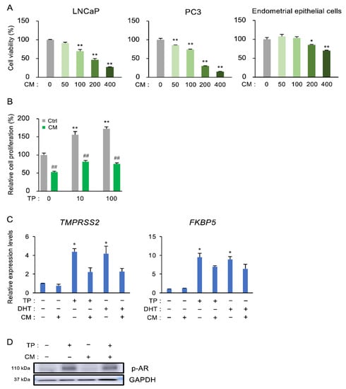 The inhibitory effect of CM on the proliferation of prostatic cells. (A) LNCaP cells, PC3 cells, and human endometrial glandular epithelial cell lines were treated with CM (50, 100, 200, or 400 µg/mL) for 48 h, and WST-8 assays were performed. ** p < 0.01 vs. CM (0). (B) LNCaP cells were pretreated with CM (100 µg/mL) for 1 h, then stimulated with TP (0, 10, or 100 ng/mL). WST-8 assays were performed after 24 h. ** p < 0.01 vs. Ctrl-TP (0). ## p < 0.01 vs. Ctrl for each treatment. (C, D) LNCaP cells were stimulated with TP (100 ng/mL) or dihydrotestosterone (DHT, 10 ng/mL) in the presence of CM (100 µg/mL), and then qPCR analyses (C) for TMPRSS2 and FKBP5, and western blotting for phosphorylated androgen receptor (D) were performed after 24 h. * p < 0.01 vs. intact.