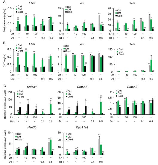 Testosterone production is regulated by luteinizing hormone (LH), which is released by the pituitary gland. LH induces the release of cyclic AMP (cAMP), which results in the activation of protein kinase A (PKA) and the expression of steroidogenic enzymes [8]. To further investigate the direct effect of CM on the secretion of testosterone and DHT from the testis, cultured primary rat-testicular cells were treated with LH or Db for 1.5, 4, or 24 h in the presence or absence of CM (Figure 5A,B). LH and Db increased the secretion of testosterone and DHT in a dose- and time-dependent manner, while CM increased the secretion of both hormones up to a threshold concentration independently of treatment with LH or Db (Figure 5A). The CM-induced increases in testosterone and DHT detected by ELISA at 1.5 h (in Figure 5A) were confirmed by LC-MS/MS (data not shown). Meanwhile, cordycepin treatment decreased the testosterone and DHT secretion. The expressions of Srd5a1 and Srd5a2 were increased by CM, but the expression of Srd5a3 was not changed (Figure 5C, Supplementary Figure S1). Similar to the pattern of testosterone secretion, Cyp11a1 was upregulated by CM up to a threshold value (Figure 5C, Supplementary Figure S1).