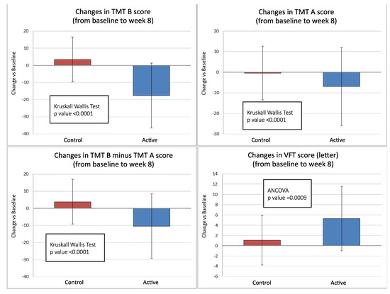 The differences between treatment groups in changes between baseline and week 8 of the three primary endpoints were statistically significant (p < 0.001) in favor of the active group. TMT-B increased in the control group (+3.46 s) and decreased in the active group (−17.63 s) (Table 2). The treatment difference was −21.01 s in favor of the active group (95% C.I. −26.80 to −15.2, p < 0.0001) (Figure 1). The decrease in TMT-A was significantly higher in the active group (−6.86 s) than in the control group (−0.37 s) (Table 2). The treatment difference was −6.08 s in favor of the active group (95% C.I. −8.54 to −3.61, p < 0.0001) (Figure 1). TMT-B minus TMT-A increased in the control group (+3.84 s) and decreased in the active group (−10.46 s) (Table 2). The treatment difference was −14.56 s in favor of the active group (95% C.I. −20.02 to −9.11, p < 0.0001) (Figure 1).