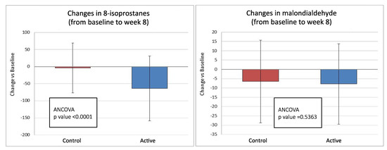 A statistically significant difference in the changes in plasma malondialdehyde levels between baseline and week 4 was observed: mean plasma malondialdehyde level was decreased by 5.22 and 10.91 pmol/mL in the control and active group, respectively (p < 0.05). This difference was no longer evident at week 8 (−2.67 pmol/mL in favor of the active group, 95% C.I. −11.22/−5.89, p = 0.5363) (Figure 2).
