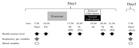 Generally, fat metabolism can be evaluated using blood variables (e.g., plasma-free fatty acid, serum total ketone concentrations). However, due to an invasive fashion for evaluating these variables, development of non-invasive assessment for fat metabolism is required. Circulating free fatty acid is converted into acetyl-CoA via β-oxidation, and acetyl-CoA is transformed to ketone bodies in the liver. Ketone bodies consist of acetoacetate, 3-hydroxybutanoic acid and acetone. Acetoacetate is initially produced, followed by 3-hydroxybutanoic acid and acetone productions mediated by enzymatic degradation or decarboxylation, respectively [9]. Among ketone bodies, acetone translates to the lung and it is excreted as an exhaled gas due to its small molecular size [10]. Several studies have demonstrated that a positive correlation was observed between breath acetone level and serum beta-hydroxybutyrate concentration [11,12,13,14]. In addition, Anderson [10] suggested that increase in breath acetone level reflected augmented fat metabolism in the liver. Thus, assessment of breath acetone level can be an alternative and non-invasive procedure to evaluate changes in fat metabolism during post-exercise period [15,16]. Additionally, since acetone is produced from free fatty acid (FFA) which is facilitated by insufficient CHO intake [7], reduced CHO intake following an exercise session may rise breath acetone level during post-exercise period. However, no study has been conducted so far to clarify the effect of insufficient CHO intake after completion of an exhaustive exercise session on breath acetone level during post-exercise period. Therefore, the purpose of the present study was to determine the influence of low CHO intake following sprint exercise on breath acetone level. We hypothesized that reduced CHO intake following the sprint exercise would increase breath acetone level.