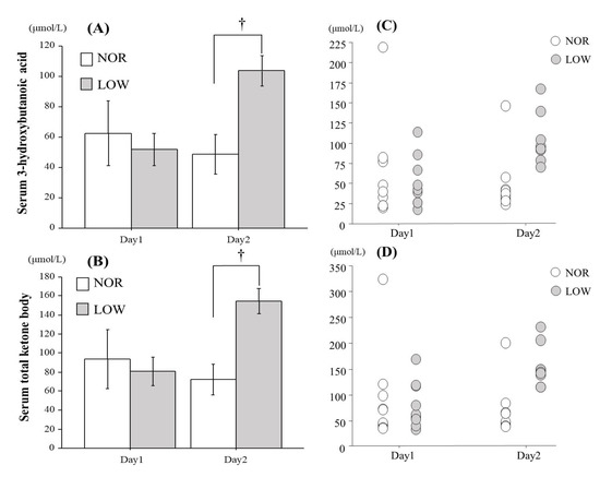 Changes in mean value of serum 3-hydroxybutanoic acid (A), total ketone body concentration (B), individual value of serum 3-hydroxybutanoi cacid (C) and total ketone body concentration (D). Values are means ± SE. † p < 0.05 vs. trial.