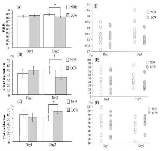 O2 and CO2 did not differ significantly between two trials in the morning on day1 and day2. There was no significant difference in RER between two trials in the morning on day1. However, LOW trial showed significantly lower RER in the morning on day2 (p < 0.05). In addition, CHO oxidation was significantly lower in the LOW trial than in NOR trial on day2, whereas LOW trial presented significantly higher fat oxidation (p < 0.05, Figure 4).