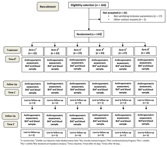 According to a computerized random numbers sequence, subjects were randomized to six arms as follows: (1) Control Diet (CD) based on CREA-AN (Research Center for Food and Nutrition, Council for Agricultural Research and Economics, Rome, Italy) guidelines [37]; (2) Low Glycemic Index Mediterranean Diet (LGIMD); (3) Physical Activity aerobic program (PA1); (4) Physical Activity combined program (aerobic activity and resistance training) (PA2); (5) LGIMD plus PA1 and (6) LGIMD plus PA2. The trial flowchart is shown in Figure 1.