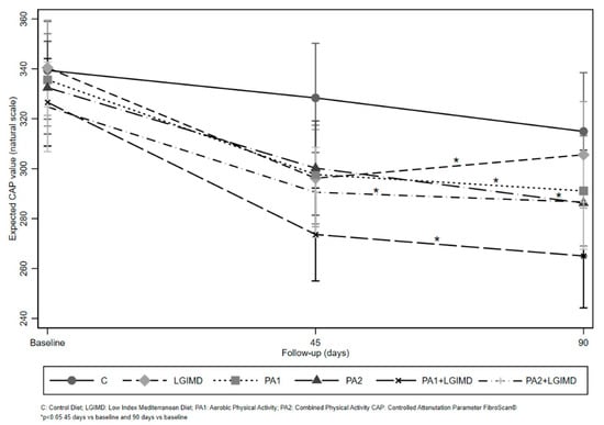 Apart from the CD, there were statistically significant principal effects of all the other intervention arms, Arms 3 and 5 showing the strongest effects (PA1: −166.35, 95%CI −242.01; −90.68 and LGIMD plus PA1: −94.10, 95% CI −170.87; −19.12). After the analysis, no statistical significance principal effect of time in reducing CAP was observed. All comparisons between different time points and Intervention Arms, except for Intervention Arm 1, showed a statistically significant decreased value for CAP. The strongest effect was observed for LGIMD plus PA1 at 45 days (−52.96, 95% CI −79.03; −26.88) and 90 days (−61.56, 95% CI −89.61; −33.50).