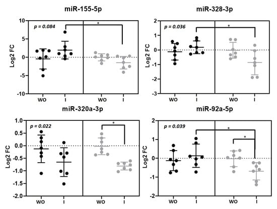 Circulating microRNAs modulated by beer and non-alcoholic beer. Scatterplots showing Log2 transformed relative fold change (FC) microRNAs in each intervention phase (n = 7). Black dots (●) correspond to beer intervention and grey dots (●) correspond to non-alcoholic beer intervention. Plasma microRNA levels were calculated with the 2−ΔΔCt method comparing with each basal timepoint. Mean ± SD of each timepoint is shown. p-value was calculated with repeated measurements ANOVA. * p < 0.05 for the paired t-test comparison between timepoints. WO: washout; I: intervention.
