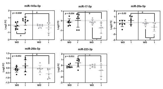 Macrophage microRNAs modulated by beer and non-alcoholic beer. Scatterplots showing Log2 transformed relative fold change (FC) microRNAs in each intervention phase (n = 7). Black dots (●) correspond to beer intervention and grey dots (●) correspond to non-alcoholic beer intervention. Macrophage microRNA levels were calculated with the 2−ΔΔCt method comparing with each basal timepoint. Mean ± SD of each timepoint is shown. p-value was calculated with repeated measurements ANOVA. WO: washout; I: intervention. * p < 0.05; # p < 0.1.