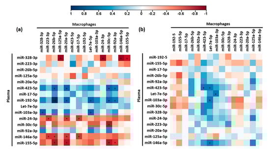 Heat map correlation plots of plasma and macrophage microRNAs modulated beer (a) and non-alcoholic beer (b). Correlation was calculated by Tau Kendall test. * p < 0.05. Blue cells represent positive correlations while red cells represent negative correlations. The intensity of the colour represents the strength of the correlation according to the indicated colour key.