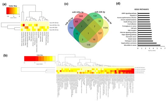 Functional analyses of modified plasma microRNAs. (a) Cluster heat map of KEGG pathways significantly enriched among modulated plasma microRNAs. (b) Cluster heat map of GO biological processes significantly enriched among modulated plasma microRNAs. The colour bar represents –log10 of the enrichment p-value after FDR correction. (c) Venn diagram showing common targets of the modulated microRNAs. (d) Bar chart of the most represented KEGG pathways (FDR adjusted p-value < 0.001) of the predicted and validated targets of modified plasma microRNAs. X-axis represent –log10 of the enrichment p-value after FDR correction.