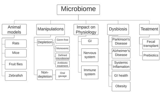 Currently, the field of microbiome research employs rodents (mice and rats), the fly Drosophila melanogaster, and the fish zebrafish as animal models. Most manipulations involve either complete/partial depletion of the microbiome using specific rodent models or microbiome transplants using oral gavage. Research has shown that the microbiome is heavily involved in improper development of the gastrointestinal tract and the nervous and immune systems. A link has also been made between imbalances in the gut microbiome, also known as dysbiosis, and certain diseases, including Parkinson’s and Alzheimer’s disease and obesity, among others. Gut dysbiosis is currently treated in humans using prebiotics and/or fecal transplants. GI: gastro-intestinal tract.