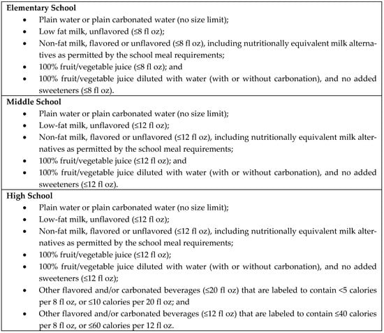 Recognizing that children spend approximately 6 h per day for at least 180 days per year in school in the United States [4] and often consume up to half their daily calories there [4,5], reducing availability and consumption of sugary beverages in schools has been a key population-level intervention and policy strategy for reducing children’s and adolescents’ intake of sugary drinks [6]. Prior to 2014, there was a patchwork of state and local policy strategies governing school food and beverage availability in the United States and restricting the availability of sugary drinks in schools [7,8,9,10]. Research has demonstrated the impact of reducing the availability of sugary drinks in schools through changes in state or local policies on student beverage purchasing and/or consumption [11,12,13,14,15,16,17,18,19,20,21,22,23,24,25,26,27]. Yet, it was not until the Healthy, Hunger-Free Kids Act of 2010 [28] that the U.S. Department of Agriculture (USDA) possessed the statutory authority to regulate foods and beverages sold in schools outside of the school meal programs, which are widely available in most schools throughout the United States (and frequently sold to children internationally through canteens and local vendors) [29,30,31,32,33]. To implement the Act, the USDA issued an interim final rule in June 2013 governing the sale of foods and beverages sold in schools in competition with the National School Lunch Program and the School Breakfast Program (i.e., competitive foods and beverages) [34]. The interim final rule took effect with the beginning of school year 2014–2015; a final rule was issued in July 2016 and renamed the guidelines as the Smart Snacks in School standards [35]. Figure 1 outlines the beverages that are allowed to be sold in schools under the Smart Snacks rule (they are the same standards that applied under the interim final rule).