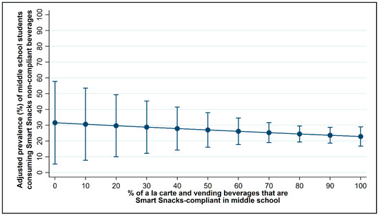 Multi-variable logistic regression models were computed examining the association between student consumption of non-Smart Snacks-compliant beverages (at both the 10 and the 60 kcal thresholds which are akin to diet and low-calorie beverages, respectively) and the proportion of à la carte and vending machine beverages that were Smart Snacks compliant, controlling for district policy meeting Smart Snacks for beverages in à la carte and vending machines, as well as school- and student-level characteristics. Models were computed separately for middle school and high school students, based on school grade level. Adjusted prevalence estimates were computed from these models by the proportion of Smart Snacks-compliant à la carte and vending machine beverages, at values ranging from 0% to 100% (in intervals of 10%) Smart Snacks-compliant beverages. Analyses were conducted in Stata/SE (version 15.1, StataCorp LP, College Station, TX, USA; 2016) accounting for the survey design and weights.